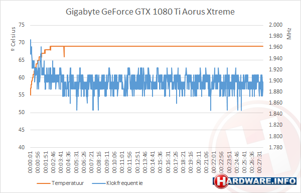 Na drieënhalve minuut bereikt de Gigabyte Aorus Xtreme een temperatuur van 69 graden Celsius. De kloksnelheid blijft dan variëren tussen de 1915 en 1880 MHz, waardoor de grafiek er ongeveer uitziet als die van de Founders Edition - alleen loopt de lijn dan wel een stuk hoger.