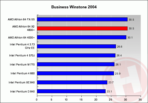 De office-applicaties benchmark Business Winstone 2004 kan vrijwel geen profijt halen uit een tweede core. De AMD Athlon 64 X2 presteert in deze benchmark gelijk aan de bestaande Athlon 64 FX-55, net wat beter dan de Athlon 64 4000+. AMD processors scoren traditioneel goed in deze benchmark en zodoende vinden we de drie AMD processors dan ook bovenaan in de grafiek.
