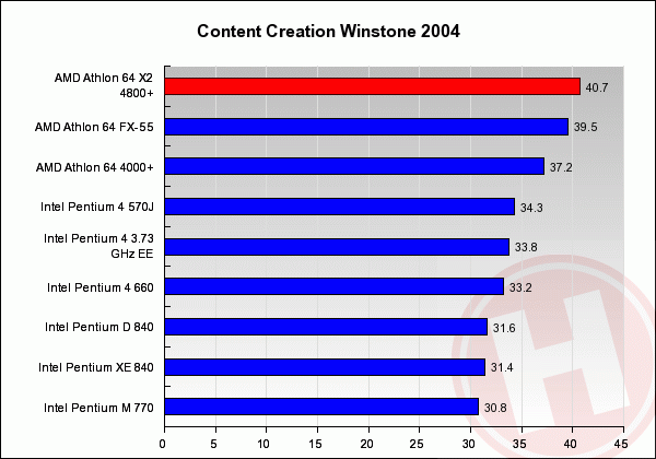 Ook bij Content Creation Winstone 2004 is het nut van een tweede core uiterst beperkt. De tweede core van de Athlon 64 X2 4800+ zorgt er wel voor dat deze nieuwe processor de recordscore van de AMD Athlon 64 FX-55 ruim evenaart. Met een score van 40.7 is de AMD Athlon 64 X2 4800+ ruim 28% sneller dan de snelste Intel dual-core processor.