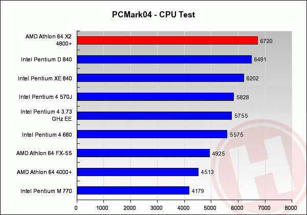 De PCMark04 CPU-test is één van de benchmarks waar AMD processors traditiegetrouw het onderspit delven. Binnen deze benchmark worden namelijk veelvuldig twee taken tegelijkertijd uitgevoerd, waardoor Pentium 4's met HyperThreading een flinke voorsprong konden boeken. Dual-core processors kunnen zodoende natuurlijk ook zeer goede PCMark04 scores behalen. Eerder al zagen we dat de Pentium D 840 en Pentium XE 840 beter presteren dan de Pentium 4 570J, maar de AMD Athlon 64 X2 4800+ gaat daar nog eens flink overheen. De score van 6720 PCMark04 is met afstand het meeste wat we ooit hebben gemeten bij een enkele processor.