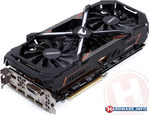 Ook Gigabyte heeft zijn GTX 1080 Ti wat dikker uit laten vallen dan voorheen. De drie fans vallen gedeeltelijk over elkaar heen - daardoor is deze kaart niet bijzonder lang - en worden omgeven door de nodige verlichting, waarbij het grote kruis in het midden het meest opvalt. Het dubbele kogellager moet zorgen voor een lange levensduur van de fans.