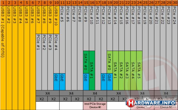 De X299 bevat net als de Z270 erg veel I/O-poorten, die flexibel zijn in te zetten. In totaal biedt de chipset 30 I/O-lanes, die te gebruiken zijn voor PCI-Express 3.0, Serial ATA of USB 3.0. Niet alle lanes kunnen voor alle drie de protocollen gebruikt worden. In totaal kunnen er maximaal 24 lanes gebruikt worden als PCIe 3.0, maximaal acht als SATA 600 en maximaal 10 als USB 3.0. Wanneer een moederbordfabrikant ervoor kiest om de maximale hoeveelheid SATA 600 en USB 3.0 aansluitingen te bieden, blijven er dus zes PCIe 3.0 lanes over. De flexibiliteit gaat echter ook weer zover dat moederbord fabrikanten meerdere M.2-sloten voor moderne SSD’s kunnen plaatsen (waarvoor elk vier PCIe lanes nodig zijn), die uitgeschakeld worden zodra deze gebruikt worden voor een of meer Serial ATA-aansluitingen. Hoe de verschillende I/O-lanes op alle X299 moederborden exact ingezet zijn is een aardige puzzel en zullen we in onze moederbord reviews zo goed mogelijk proberen uit te zoeken.