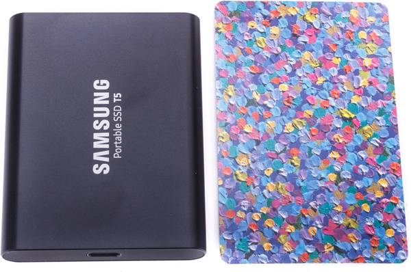 De Samsung T-serie externe SSD's is al sinds de eerste generatie klein, licht en snel. Ook de T5 zet dit beeld door. Waar de T3 wat groter was dan de voorganger, is de T5 juist weer wat kleiner, net wat kleiner dan een creditcard. Het gewicht is vrijwel onveranderd: 51 gram. Kortom, een kleinood dat je zelfs probleemloos in het borstzakje van een overhemd kunt steken. Toch is dit kleinood stukken sneller dan een grotere externe schijf op basis van een harddisk.