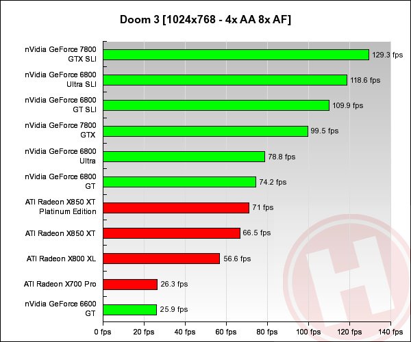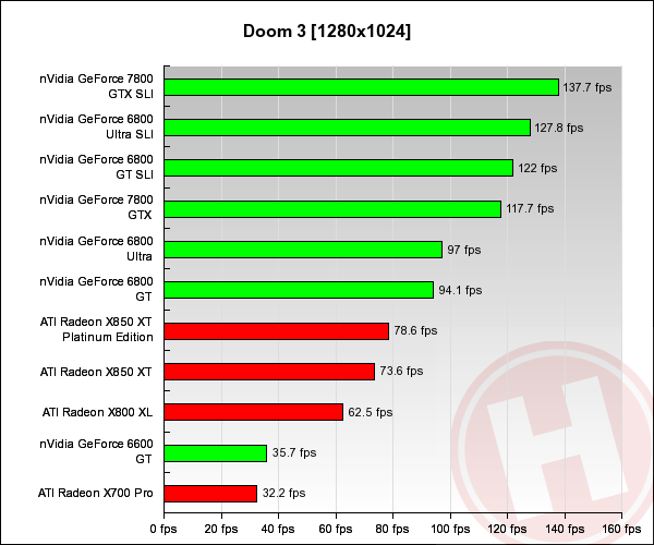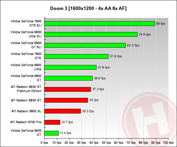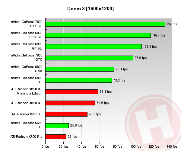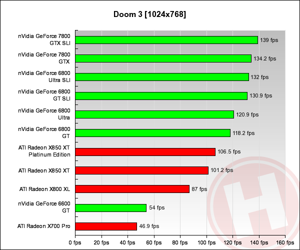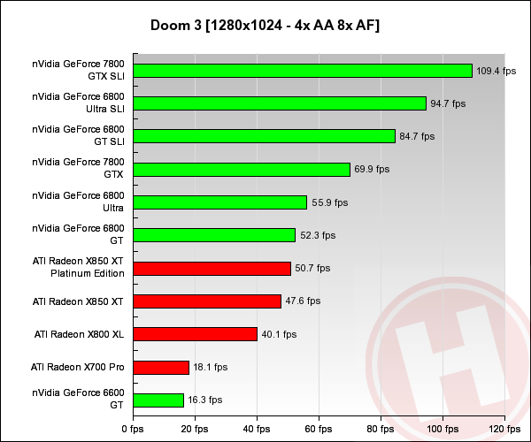 Doom 3 is altijd al het domein geweest van nVidia waarbij de GeForce 6800 Ultra de X850 XT PE van ATI in alle benchmarks achter zich laat. Kijken we naar de benchmarks dan is duidelijk dat de processor in de lagere resoluties voor een deel de limiterende factor is. Het verschil tussen één en twee kaarten is in het geval van de GeForce 7800 minder dan vijf beelden per seconde, wat aangeeft dat je om in 1024x768 te spelen zeker geen SLI configuratie hoeft aan te schaffen. Naar mate we de resolutie verhogen en ook anti-aliasing en antistropic filtering gaan gebruiken worden de verschillen echter groter en komt de GeForce 7800 GTX weer duidelijk als snelste chip uit de bus.