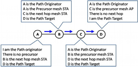 Het beste pad wordt binnen 802.11s gevonden via de zogenaamde path selection. Fabrikanten maken hierbij gebruik van hun eigen protocollen, maar voor 802.11s moeten ze ook gebruikmaken van het standaardprotocol. Dat is Hybrid Wireless Mesh Protocol. Dat bevat zowel een proactieve als een reactieve methode. De stations sturen een frame naar een onbekend doel en bepalen op basis daarvan dynamisch het beste pad. Om duidelijk te krijgen wat de rol van ieder station is, wordt van een specifieke terminologie gebruikgemaakt. Stel dat een frame van node A naar node D moet; dan begint een doorgeefspelletje. A geeft het frame door naar zijn buurman B. Het blijkt dat het frame verder moet en B geeft het door naar zijn buurman C. C doet vervolgens hetzelfde en dan komt het frame uiteindelijk uit bij zijn eindstation.