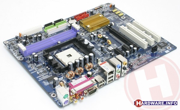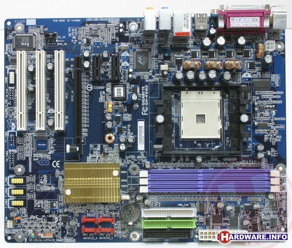 Gigabyte's nieuwe Socket 754 is te herkennen aan de vertrouwde blauw kleur. Ook dit bord maakt gebruik van de nVidia nForce 4 4X chipset en heeft een drietal geheugensloten, een PCI-Express x16 slot voor videokaarten en drie normale PCI-sloten. Het aantal PCI-Express x1 sleuven is bij Gigabyte 'slechts' 2. Dit mag echter geen probleem zijn: het is vrijwel ondenkbaar dat je in een budget systeem drie PCI-Express x1 kaarten gaan plaatsen.