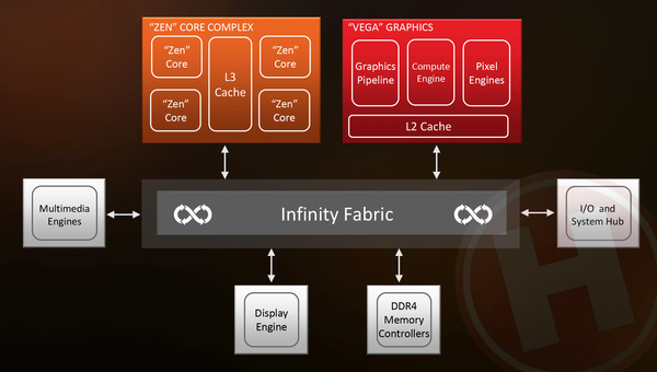 Intern zijn alle onderdelen van de chip met elkaar verbonden via het Infinity fabric, een bus waar AMD naar eigen zeggen vier jaar lang aan heeft gewerkt. Naast de Zen-cores en de Vega-GPU zijn ook de multimedia-engine, de I/O-hub, de display-engine en de DDR4-geheugencontroller rechtstreeks verbonden met het Infinity fabric.