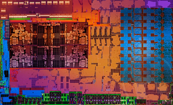 Het die shot van een Raven Ridge APU, met links de Zen-cores en rechts de Vega-GPU.