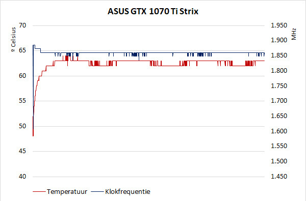 De ASUS Strix lijkt geen moeite te hebben om een hoge kloksnelheid vast te houden. Er zijn wat dipjes, maar die zijn minimaal. De temperatuur zit daarbij tussen de 62 en 64 graden.