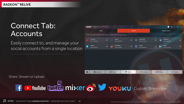 ReLive is AMD's antwoord op het geroemde Shadowplay van Nvidia. Met Crimson ReLive introduceerde AMD deze opnamesoftware om gameplay op te nemen, en daarbij het encoden van de videostream te laten afhandelen door de GPU. Het was met ReLive vanaf het begin al mogelijk om de gameplay op te laten nemen en lokaal op te slaan als videobestand. Met Adrenalin doet AMD een flinke poging om populariteit te winnen bij online streamers. In de Radeon Settings is een nieuw Connect-tabblad geplaatst, vanwaar streams en uploads geregeld kunnen worden. Er kan van maar liefst acht platformen gebruik gemaakt worden: YouTube, Twitch, Twitter, Facebook, Sina Weibo, Stage Ten, Youku en Mixer.