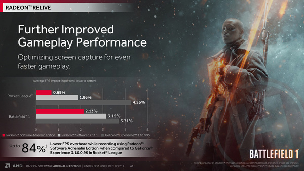 Daarnaast is de overhead van ReLive verlaagd, is er ondersteuning om in Vulkan gameplay op te nemen, kan ReLive omgaan met meerdere monitoren in Eyefinity, is er ondersteuning voor chroma key om een achtergrondkleur van een webcam in een stream weg te filteren en kunnen geluidstracks los van video worden opgenomen om het bewerken achteraf makkelijker te maken.