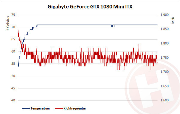 Initieel klokt de 1080 Mini ITX op 1835 MHz, maar naarmate de temperatuur toeneemt, wordt deze teruggeschroefd. Vanaf zo'n 60 graden zien we kloksnelheden onder de 1800 MHz. Vervolgens schommelt de gpu gedurende de rest van de test tussen de 1721 en 1771 MHz bij een temperatuur van 71 graden.