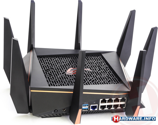 ASUS heeft met de ROG Rapture GT-AC5300 een opvallende verschijning in huis. Het apparaat heeft een compromisloos design meegekregen, dat duidelijk is bedoeld om een specifieke - om niet te zeggen gaming - doelgroep aan te spreken. We vinden het geruststellend dat in deze tijden, waarin vooral mesh-oplossingen de huiskamerwaardigheid boven zaken als toffe ontwerpen, duizelingwekkende aantallen antennes en aansluitingen en dat soort dergelijken plaatsen. Niet de Rapture; die heeft gewoon lekker acht antennes en evenzoveel lan-poorten, waarvan de helft tot twee supersnelle verbindingspunten kunnen worden gecombineerd.