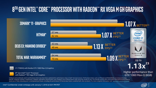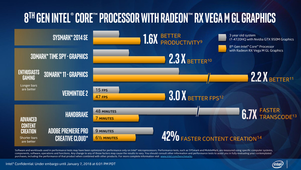 Voor de prestaties op het gebied van gaming vergelijkt Intel met een recenter systeem, bestaande uit een Core i7 8550U en een GTX 1050. Afhankelijk van de benchmark wordt gesteld dat de RX Vega M GL zo'n 10 tot 40 procent betere prestaties moet opleveren. De snellere RX Vega M GH wordt tegenover de GTX 1060 Max-Q gezet, waarbij wordt gesproken over 7 tot 13 procent betere prestaties. Kortom, Intel belooft fatsoenlijke gaming prestaties op full hd resolutie, met redelijke kwaliteitsinstellingen.