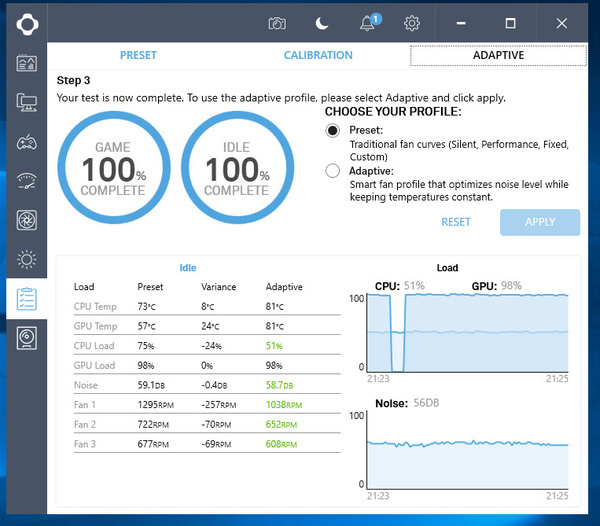 Wij zijn echter vooral benieuwd naar de slimme, adaptieve werking. Om deze mogelijk te maken moeten we eerst een proces van drie stappen doorlopen. De eerste stap is een meting van de standaard 'silent mode' preset. In eerste instantie wordt tijdens een idle-situatie gemeten wat de cpu- en gpu-temperaturen zijn, en op welk toerental de ventilatoren hierbij draaien. Hierna moet je als gebruiker zorgen voor dat de processor minimaal 20% en de videokaart minimaal 50% belast wordt. NZXT raadt je aan om dit te doen door een game te spelen. Zodra de software - die de loads van beide bijhoudt - bemerkt dat dit het geval is, wordt een baseline meting voor de 'load' situatie gestart. In ons geval zorgde deze meting van de silent preset ervoor dat de processortemperatuur opliep tot 94 graden, omdat de ventilatorsnelheid dus niet aangepast wordt op de temperatuur van de processor, maar alleen op die van de GPU die wel redelijk koel bleef. Helaas laat de software bovendien niet weten wanneer deze stap voltooid is, maar gaat automatisch verder naar het tweede deel van de test.