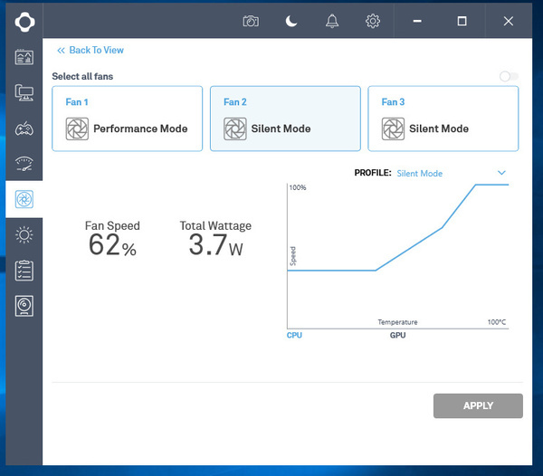 NZXT raadt gebruikers aan om niet alleen de casefans op het smart device aan te sluiten, maar ook de ventilator van de processorkoeler met één van de drie kanalen van het smart device te koppelen. Heb je dat eenmaal gedaan en ben je ingelogd in de CAM software, dan zullen de ventilatoren in eerste instantie via een temperatuurgestuurd profiel werken. Middels 'silent mode ' en 'performance mode' profielen kan gekozen worden hoe de draaisnelheid van de fans moet reageren op toename van de temperatuur van de gpu. Vreemd genoeg lijkt het niet mogelijk om in ieder geval één kanaal aan de cpu-temperatuur te koppelen, ook als de ventilator(en) van de processorkoeler wél op het smart device zijn aangesloten.