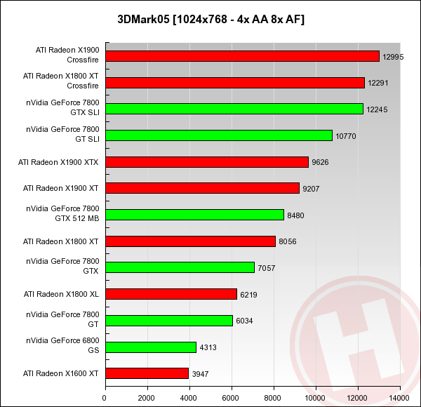 In 3DMark05 scoort de X1900 XT ruim meer dan 10000 punten, 10736 om precies te zijn. Hiermee wordt de GeForce 7800 GTX 512 MB duidelijk voorbij gestreefd. De XTX doet er nog een schepje bovenop en scoort 11119 punten, een score die in de buurt komt van een GeForce 7800 GT SLI-opstelling. De X1900 Crossfire combinatie scoort 13467 in 3DMark05.