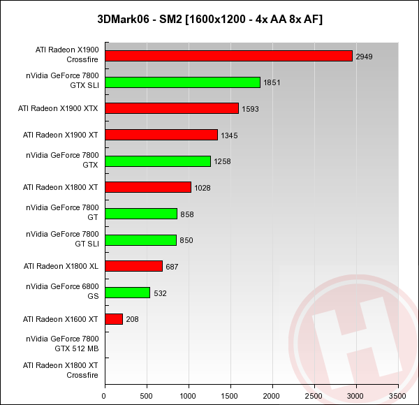 De X1900 XT behaalt in de standaard 3DMark06 test een eindscore van 4880 punten, ruim beter dan de GeForce 7800 GTX. De X1900 XTX scoort 5077 puten, in Crossfire presteert de X1900 7180 in 3DMark06. Kijken we naar de SM3 deelscores, dan blijkt dat hier het prestatieverschil tussen nVidia en ATI verder wordt vergroot: de Radeon X1900 is duidelijk gemaakt voor toekomstige games die heel veel pixel shading power vereisen!