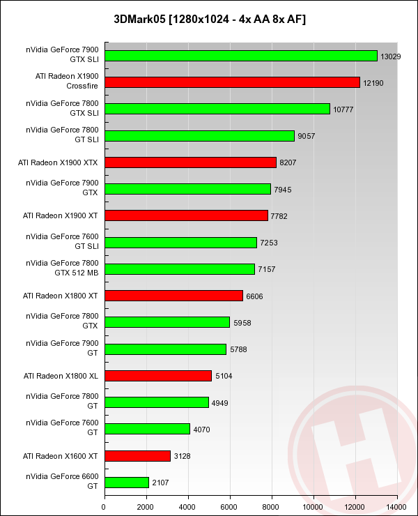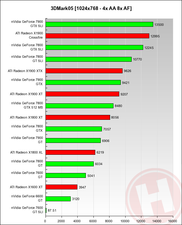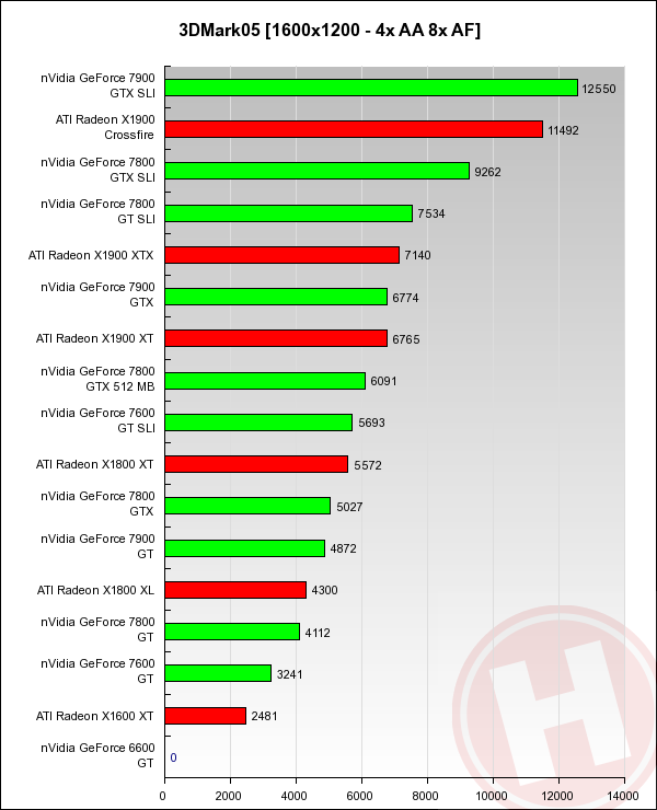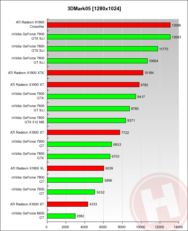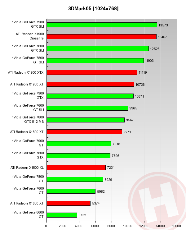In 3DMark05 behaalt de nieuwe GeForce 7900 GTX in SLI-opstelling in de meeste gevallen de hoogste score, al is het verschil met ATI Radeon X1900 Crossfire klein. Als er een Radeon X1900 XTX Crossfire had bestaan, zou ATI absoluut aan de winnende hand zijn geweest. De nieuwe 7900 GT en GTX kaarten presteren duidelijk beter dan hun 7800 voorlopers, maar vooral het prestatieverschil tussen de 7600 GT en 6600 GT is opvallend! In deze benchmark blijft de nieuwe mid-range kaart de ATI Radeon X1600 XT ook duidelijk voor, wat de onverwachte introductie van de helaas nog niet getest X1800 GTO verklaart.