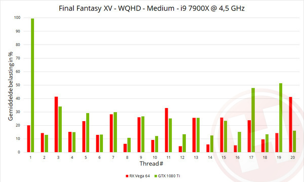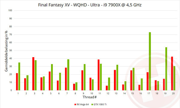 De workload wordt in Final Fantasy XV relatief goed verspreid over meerdere threads, zeker op ultra settings. Over het algemeen lijkt de Nvidia-driver in dit spel de cpu wat zwaarder te belasten dan die van AMD.