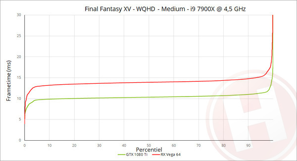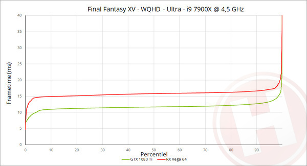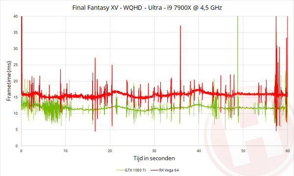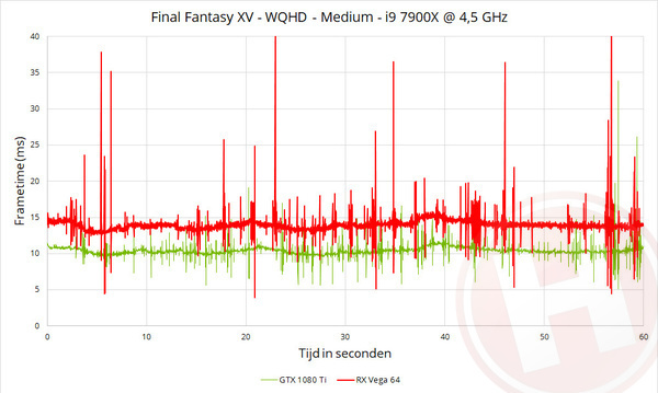 Om dieper in te gaan op de prestaties van AMD en Nvidia in Final Fantasy XV hebben we onze testruns met de Nvidia GeForce GTX 1080 Ti en AMD Radeon RX Vega 64 uitgebreid geanalyseerd. We meten de frametimes van beide kaarten met behulp van PresentMon en het processorgebruik door middel van MSI Afterburner.