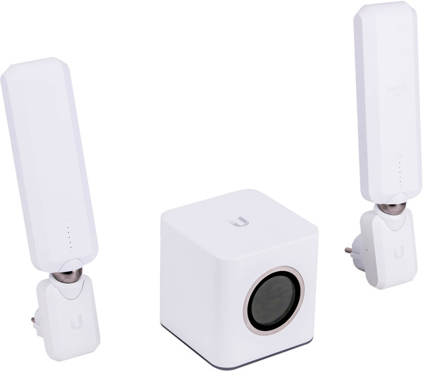 Het design van het AmpliFi-systeem is absoluut kenmerkend. Het basisstation is een soort vierkante box met een rond touch schermpje aan de voorzijde en een led lichtstreep die aan de onderzijde rondom het apparaat loopt. De hoeken van AmpliFi zijn kunstig afgerond en bovenop de box prijkt het Ubiquiti logo. De satellietnodes zijn eveneens voorzien van het logo en lijken nog het meest op platgeslagen antennes van een traditionele router.