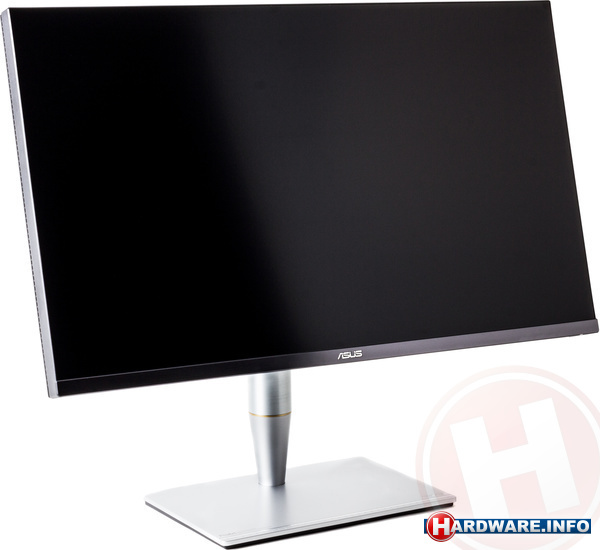 Asus heeft de PA32UC-K voorzien van een net wat meer frivole behuizing dan veel andere op professionals gerichte schermen. Het paneel is bevestigd op een opvallende ronde poot van zilverkleurig metaal. Het onderste gedeelte van de poot loopt taps toe naar de brede, vierkante voet. De overgang tussen beide delen wordt gemarkeerd door een goudkleurig randje.