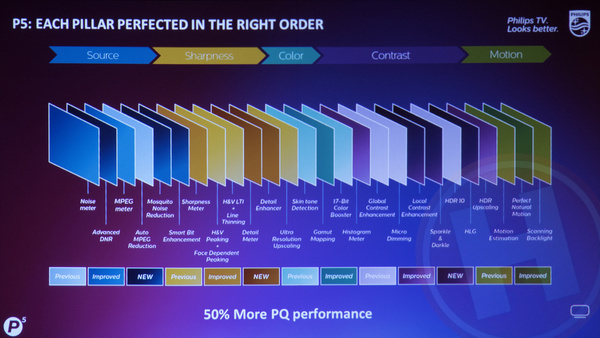 De televisie maakt gebruik van de P5 processor die Philips vorig jaar introduceerde en die dit jaar ongewijzigd wordt doorgezet naar de nieuwe high-end televisies. Die P5 processor zorgt voor ruisonderdrukking, verscherping, kleuroptimalisatie, contrastoptimalisatie en bewegingsoptimalisatie, waarbij je via het instellingenmenu elk van deze onderdelen kunt tunen of geheel kunt uitschakelen. In de dynamische modus staan alle functies hun maximum, wat een overdreven resultaat oplevert, maar met handmatige tuning kan je de verwerking indien gewenst optimaal aanpassen op de kwaliteit van het inkomende signaal.