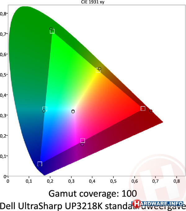 Dell belooft dat de UP3218K honderd procent van AdobeRGB (en logischerwijs ook sRGB) kan weergeven. In de standaardmodus is dat inderdaad het geval. Zet je het scherm in de fabrieksaf gekalibreerde modi 'AdobeRGB' en 'sRGB', dan wordt de kleurverzadiging in beide gevallen net iets te ver teruggedraaid. We meten in die modi respectievelijk 98,7 en 98,4 procent van het gelijknamige kleurbereik. Voor DCI-P3 belooft Dell sowieso niet meer dan 98 procent dekking. Het groene kleurpunt van DCI-P3 ligt immers buiten het native kleurbereik van de monitor, net als bij de PA32UC-K het geval was.