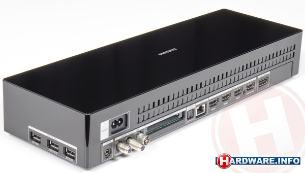 Waar de tv vrij ingetogen is, kunnen we dat niet zeggen voor de nieuwe one connect box. Omdat de box nu ook de voeding voor het scherm bevat, is deze flink gegroeid ten opzichte van voorgaande generaties. Het idee is natuurlijk om deze in een av-meubel, uit het zicht weg te werken en we zouden zeker ook niet aanraden om hem in het zicht naast de tv te plaatsen. De vrij plompe, zwarte doos bevat alle aansluitingen die de tv biedt. Dat zijn naast viermaal hdmi, een netwerkpoort, optische digitale uitgang, driemaal usb en antenne-ingangen voor DVB-C, DVB-T en DVB-S.