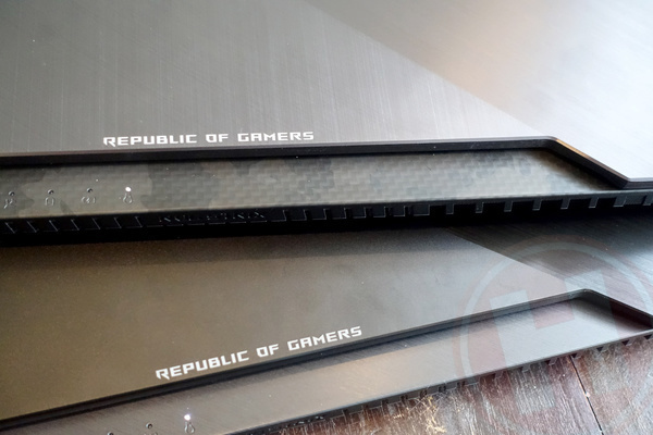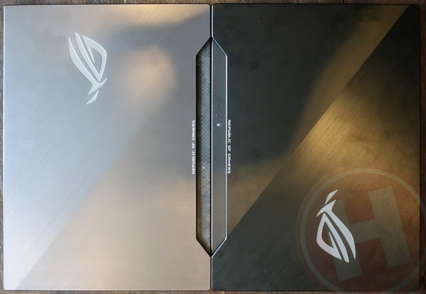 Wederom zien we hier bij beide linksonder een ander patroon dan rechtsboven, dit keer wel verschillend: carbon bij de Scar II en een geborsteld-metaal-look bij de Hero II. Volgens Asus is bij de Hero II van een proces met vier verschillende lagen gewerkt, bij de Scar II zijn zelfs acht lagen toegepast om de textuur te krijgen zoals gewenst. De plastic onderzijde van beide machines is identiek.