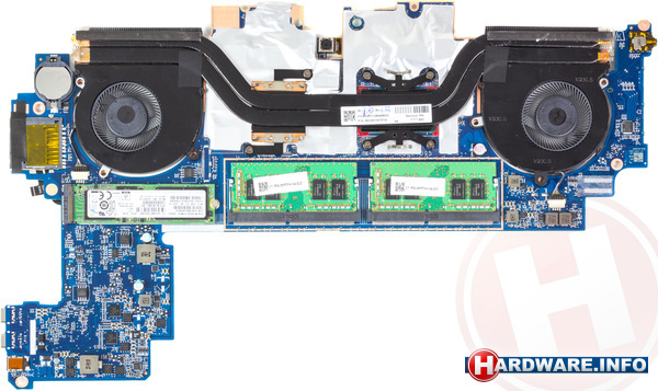 Zoals je op de afbeelding kunt zien, kijk je vervolgens tegen de achterkant van het moederbord aan. De processor, gpu, geheugenmodules en ssd wijzen richting de metalen achterklep. Dat maakt het er niet eenvoudiger op om onderdelen te verwisselen. Alleen de accu kun je direct bereiken.