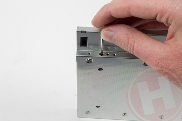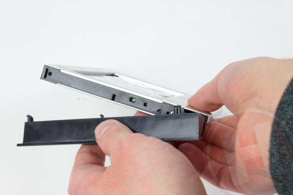 Pak het metalen bevestigingsplaatje afkomstig van de dvd-speler van de laptop en schroef het vast naast de sata-connector aan de achterzijde, om vervolgens het frontje van de dvd-speler vast te klikken aan de bredere zijde van de bracket. Bij onze laptop bleek een van de plastic haakjes van het frontje net wat breder dan het gaatje in de bracket, maar met een beetje bijvijlen klikte het frontje uiteindelijk netjes op zijn plek.