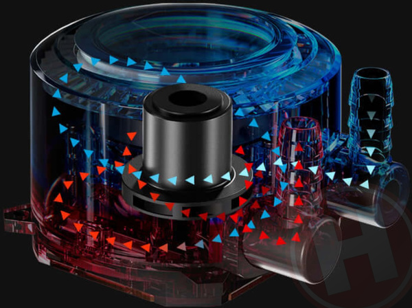 Binnenin het koelblok van de MasterLiquid is de waterpomp verwerkt. Cooler Master heeft gekozen voor een dual chamber ontwerp, waarmee de koelprestatie en warmteafvoer hoger moeten zijn. Bovendien stelt Cooler Master dat zijn cold plate op deze koeler maximaal contact met het water maakt doordat de koelvinnetjes erg dun zijn gemaakt, en er zo meer naast elkaar passen. Er is een drie-fasige motor gebruikt om zo stil mogelijk zijn werk te kunnen doen. De slangen van het koelblok naar de radiator zijn dubbellaags uitgevoerd voor een betere bescherming en hebben aan de buitenkant bovendien nog een sleeve gekregen.
