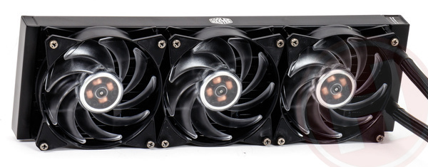 De volledig addressable rgb leds komen we niet alleen bij het cpu-blok tegen, maar ook in de ventilators die Cooler Master meelevert met de set. Dit zijn drie 120 mm-exemplaren, en met dit aantal is de kleurenregenboog nog net wat overweldigender dan met twee fans. Het aansturen van al deze rgb-functionaliteit maakt Cooler Master wat makkelijker door een 3-naar-1 rbg-splitter en een rgb-controller mee te leveren.