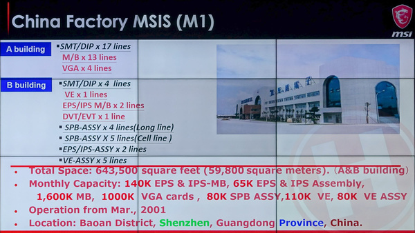 MSI heeft twee grote fabrieken in China, een in Shenzhen en een in Kunschan. In de eerste worden onder meer moederborden, videokaarten en desktopsystemen gemaakt, in de tweede ook notebooks. Wij waren in de fabriek in Shenzhen om te zien hoe dekstopsystemen en videokaarten worden gefabriceerd.