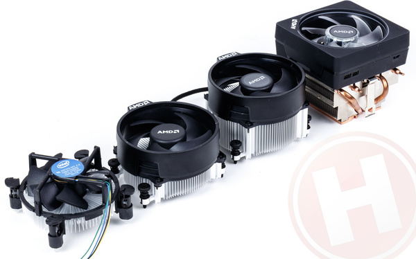 Bij AMD krijg je, afhankelijk van het type processor dat je aanschaft, een van de drie Wraith-koelers. De Wraith Stealth lijkt het meeste op de boxed koelers van Intel, maar zelfs dit relatief simpele model is al 70% zwaarder van gewicht. De Spire is een hogere variant die bovendien een koperen contactplaat voor de cpu heeft, terwijl de Wraith Prism een meer klassieke top-down koeler met een fors koelblok en heatpipes is. Deze bovendien van rgb-verlichting voorziene koeler krijg je alleen bij het topmodel, de Ryzen 7 2700X.