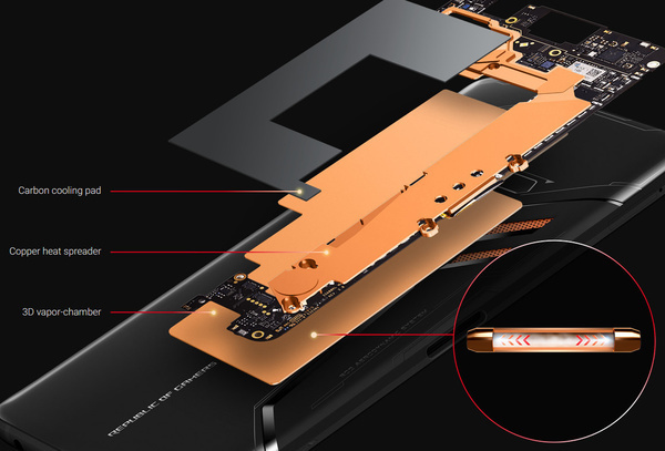 Een extra overgeklokte chip vraagt om een goede koeling om te voorkomen dat de prestaties binnen de kortste keren teruglopen door throttling. Asus heeft dus een imposant koelsysteem geplaatst, van buiten aangeduid als het 'RoG Aerodynamic System'. Op de render van het binnenwerk hierboven zien we allereerst een vapor chamber, een soort ultraplatte heatpipe met een zeer hoge efficiëntie voor het afvoeren van warmte, die ook wordt gebruikt in de betere cpu-koelers. Daarboven zit de forse koperen heatspreader, die de hitte gelijkmatig over het toestel verdeelt. We merken tijdens het gamen nauwelijks een duidelijk bepaalde hotspot, al wordt het toestel als geheel natuurlijk wel behoorlijk warm.