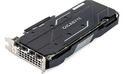 De Gigabyte 1660 Ti Gaming OC is een wat langere en smallere videokaart, voorzien van drie ventilators op een koelblok met drie 6mm heatpipes. Het koelblok maakt tevens direct contact met de stroomvoorziening om warmte af te voeren. De kaart is 2 slots dik en amper breder dan de pci-bracket zelf. Daarmee is het potentieel een interessante kaart voor itx builds. We komen een kunststof backplate tegen en op het i/o heeft Gigabyte gekozen voor drie keer displayport en een enkele hdmi-aansluiting. Ook deze Gaming OC wek je tot leven middels een 8-pins peg-aansluiting.