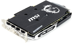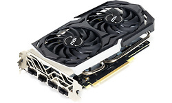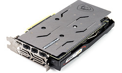 De GTX 1660 Ti Gaming X is MSI's luxere variant van de twee kaarten die de fabrikant heeft opgestuurd. De Gaming X neemt twee sloten in beslag en gebruikt twee ventilators op een koelblok met drie heatpipes om de warmte af te voeren. Het koelblok maakt geen direct contact met de stroomvoorziening, daarvoor wordt een losse plaat gebruikt. De metalen heeft een geborstelde look en is langer dan het pcb zelf om goed aan te sluiten bij het uiteinde van het koelblok. Ook MSI heeft gekozen voor drie keer displayport en een hdmi-aansluiting, en zoals op de andere kaarten komen we hier ook weer een 8-pins peg-connector tegen.