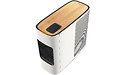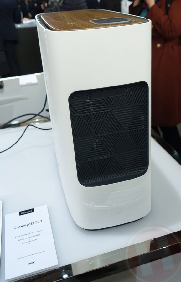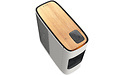 De ConceptD 500 is een fraai vormgegeven, afgeronde tower in wit, met bovenop een houtpatroon - het was ons niet duidelijk hoe 'echt' dit hout is, maar het ziet er best echt uit. In die bovenzijde zijn een draadloze lader voor smartphones verwerkt, alsmede een uitsparing waarin we vier usb-poorten (waarvan een type-c) en twee audio-aansluitingen en een sd-geheugenkaartlezer aantreffen. In de voorzijde van de machine zit een uitschuifbare houder waar je een hoofdtelefoon aan kunt hangen.