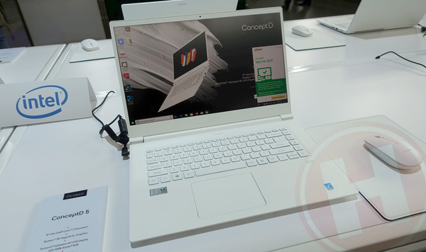 De ConceptD 5 vertoont de nodige gelijkenis met de vernieuwde Aspire 7 en is de 'thin & light' uit de reeks, met een dikte van 16,9 mm en een gewicht van 1,5 kilo dankzij een magnesium-aluminium legering aan de bovenzijde en rond het toetsenbord, en een magnesium-lithium legering aan de onderzijde, zoals we bijvoorbeeld kennen van de Swift 5. Hij is echter mat wit van kleur en heeft onder andere een geheel ander beeldscherm. Dat 15-inch scherm heeft 6,3 mm smalle randen en een ultra hd-resolutie (3840x2160), met een maximale helderheid van 400 nits. Dit ips-paneel geeft 100% van de AdobeRGB-kleurruimte weer, is Pantone-gecertificeerd en moet een kleurfout kleiner dan 2 hebben.