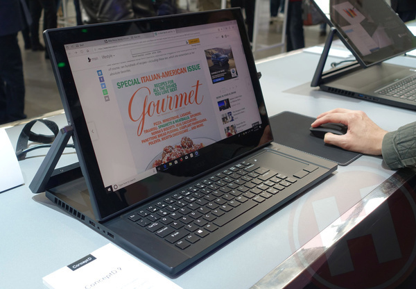 Bijzonder is zoals gezegd de schermconstructie, waardoor je het scherm dicht op het naar voren geplaatste toetsenbord kan positioneren, maar ook platleggen om met de meegeleverde digitale pen aan de slag te gaan. Anders dan bij de Triton 900 is er geen uitklapbare aansluiting voor een ontvanger voor een Xbox controller, wat logisch is gezien de positionering. De ConceptD 9 zal een 9e generatie Intelprocessor hebben, een RTX 2080 videokaart en tot 16 GB werkgeheugen, op te waarderen naar 32 GB door de gebruiker. Het gewicht van deze machine is een stevige 4,1 kilo, waarmee het meer een verplaatsbare workstation is dan een laptop die je altijd bij je hebt. De ConceptD 9 is in Europa vanaf augustus te koop, vanaf 4999 euro.