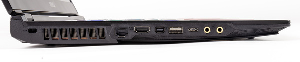 De behuizing van de GE75 mag wat dikker zijn, dat betekent wel dat er nog genoeg ruimte over is voor allerhande aansluitingen die op de slanke concurrentie soms node gemist moeten worden. Aan de linkerkant vinden we bijvoorbeeld een ethernetpoort, geschikt voor snelheden tot 2.5 gigabit, met daarnaast twee losse beeldaansluitingen: hdmi 2.0 en mini displayport. Beide zijn geschikt voor 4K-resoluties bij 60 beelden per seconde, maar de hdmi-poort biedt geen G-sync. Geschikte schermen sluit je dus beter via miniDP aan.