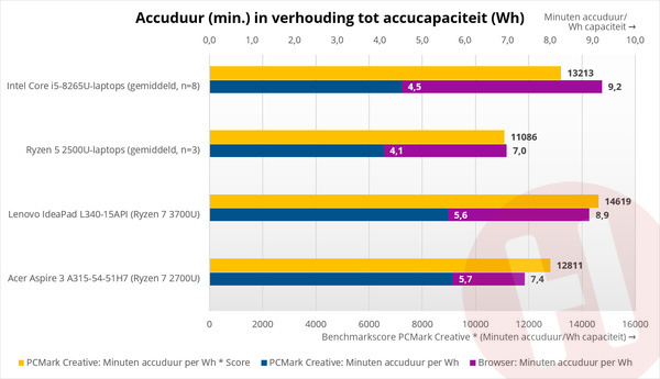 Iedere wattuur aan accucapaciteit levert de Ideapad L340-15API 8,9 minuten aan accuduur op in de Browsetest. Dat is vrijwel vergelijkbaar met de acht laptops die we hebben getest met bovengenoemde specificaties en een Intel Core i5-8265U-cpu: die halen 9,2 minuten per wattuur accucapaciteit. Bij de Aspire 3 A315 met Ryzen 7 2700U, de enige laptop met die cpu die we hebben getest, levert iedere wattuur accucapaciteit nog maar 7,4 minuten looptijd op. Bij de drie laptops met Ryzen 5 2500U die in dit artikel aan bod kwamen, bedraagt die ratio gemiddeld 7 minuten per wattuur.