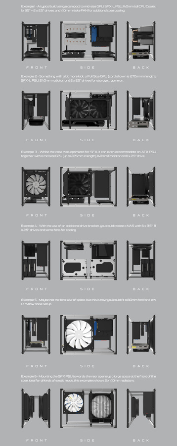 De andere helft van dit plaatje metaal wordt zoals gezegd gebruikt voor de voeding. Er is plaats voor een reguliere atx-voeding, maar dan lever je wel in op onder meer de mogelijkheid om een videokaart langer dan 22 cm te plaatsen. Voor een systeem met een losse grafische kaart valt een sfx-voeding dus aan te raden, al geeft die keuze je natuurlijk sowieso wat meer ademruimte.