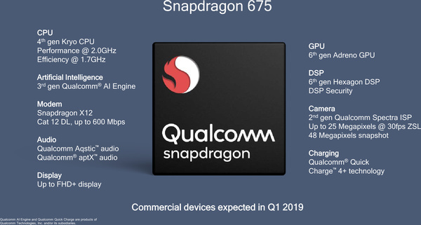 De 675 heeft een octa-core processor op basis van de Kryo 460-architectuur. Deze is opgebouwd uit twee high performance cores (Cortex A76) die op 2.0 GHz draaien en zes rekenkernen (Cortex A55) die op 1,78 GHz geklokt zijn. Het geheel wordt gecomplementeerd door de Adreno 612 die een maximale snelheid van 845 MHz biedt.