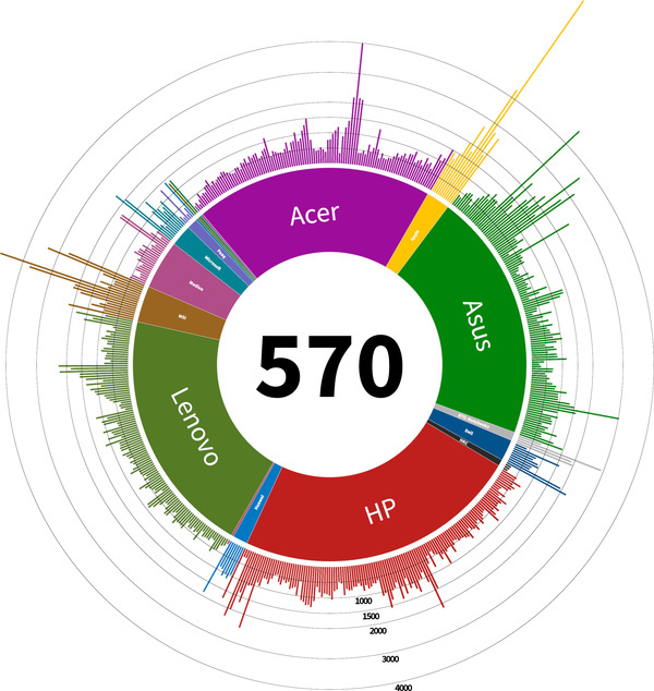 De 570 laptops in dit artikel zijn afkomstig van 18 verschillende merken, al maken ook in ons testlab vooral de grote vier – HP, Asus, Lenovo en Acer – de dienst uit. Samen leverden die merken zo’n 83 procent van alle geteste laptops, waarbij we van HP nipt de meeste apparaten testten – het waren er 133. Bovenstaand cirkeldiagram geeft zowel een indruk van de verhoudingen tussen fabrikanten, als van de prijs van ieder afzonderlijk apparaat: hoe langer de balk, hoe duurder de laptop. Je ziet daaraan bijvoorbeeld dat je voor de apparaten van BTO (lichtgrijs), MSI (bruin) of Apple (geel) over het algemeen veel kwijt bent. Daarbij moeten we nadrukkelijk opmerken dat deze fabrikanten ervoor kiezen om hun meest luxe, uitgebreide modellen naar ons te sturen (zie ook de hoofdtekst over dit onderwerp). Dat vertekent het beeld van het eigen prijspeil. HKC (zwart), Peaq (paarsblauw) en Medion (donkerroze) hebben juist vaker betaalbare laptops.