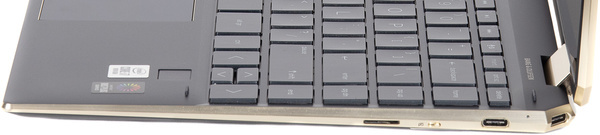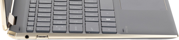 De behuizing mag kleiner zijn geworden, HP heeft er dezelfde aansluitingen in weten te verwerken als bij het oude model. Dat is knap, want bij de oude Spectre x360 13 nam de klassieke usb type-a poort al bijna de hele hoogte van de zijkant in. Voor de nieuwe dunnere Spectre zit de poort dus verstopt achter een uitklapdeurtje, zoals je soms ziet bij een ethernetpoort. Het is fijn dat HP de aansluiting zodoende kon behouden, want usb-c is nog zeker niet ingeburgerd, terwijl hij op sommige dunne convertibles van de concurrentie al wel is wegbezuinigd. Naast de usb-a poort zit ditmaal de 3,5 mm-hoofdtelefoonaansluiting. De schuine hoek daarachter bevat de powerknop met ingebouwd ledje.