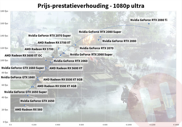 Voor full hd met ultra settings is minstens een mid-range videokaart nodig: een GeForce GTX 1660 van Nvidia of een Radeon RX 5500 XT 8GB van AMD voldoet voor 60 fps. Met een GTX 1660 Super of RX 5600 XT op referentiesnelheid scoor je in de 80 fps, met de RX 5600 XT 'OC' of een RTX 2060 benaderen we zelfs de 100 fps.